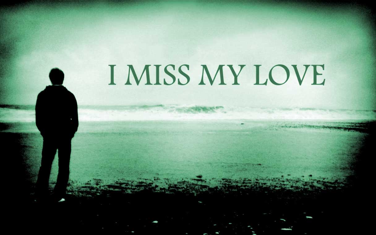 Description: A man standing on a beach next to the ocean with a message written on it that reads i miss my love.