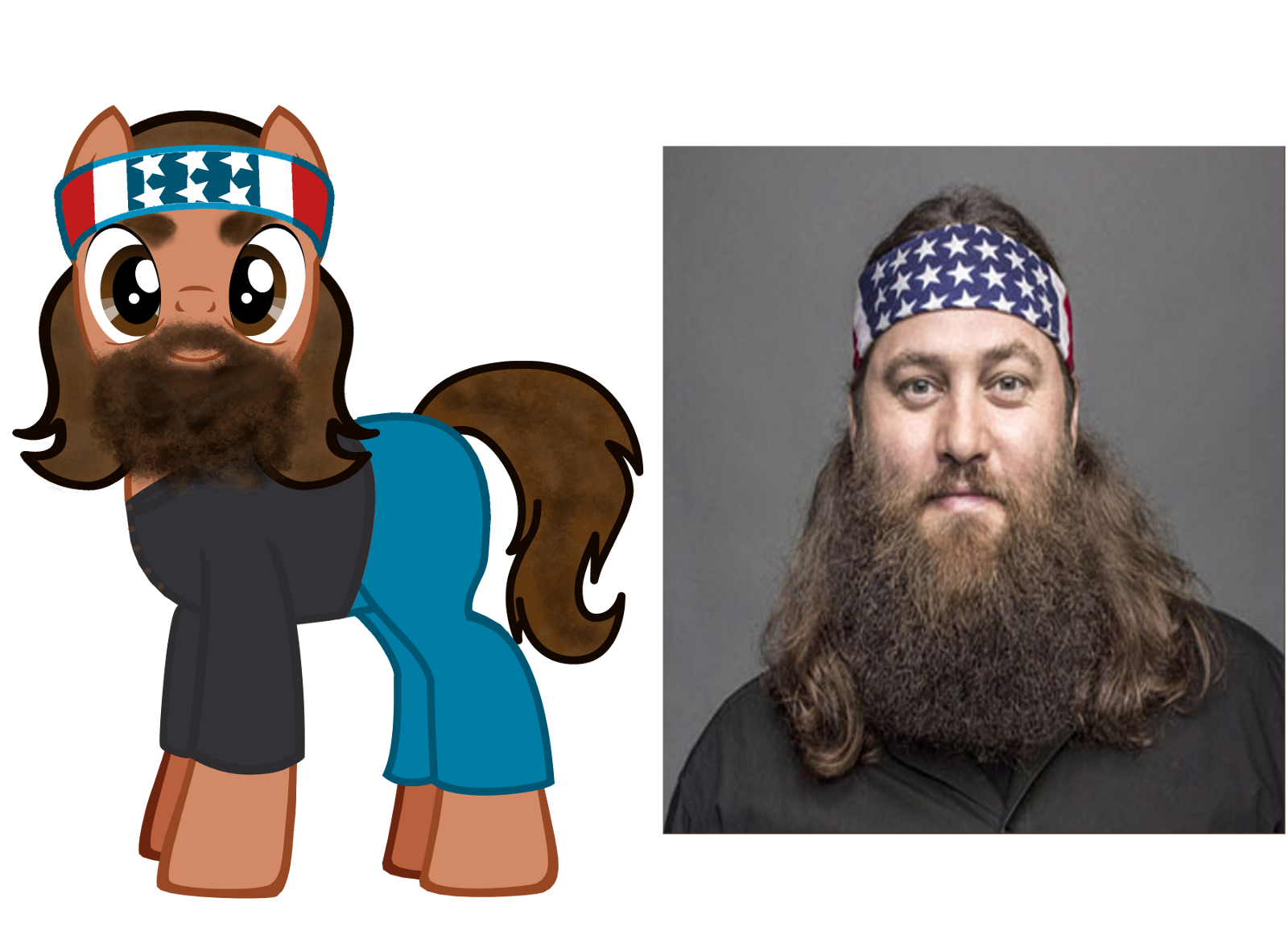 Description: A man with a beard and a bandana on his head and a pony with a bandana on his head.