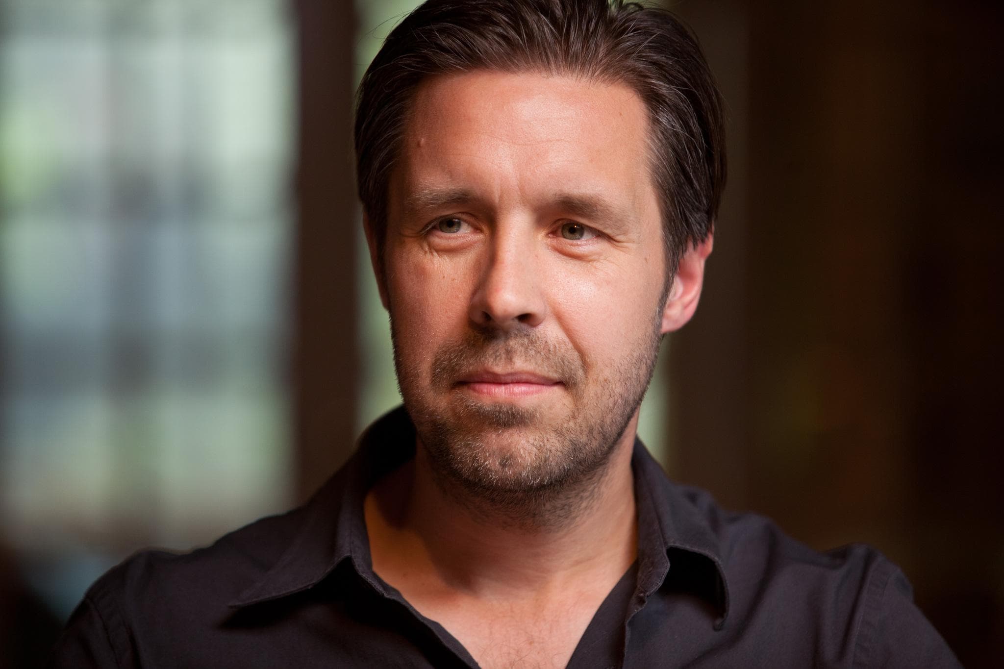 Description: A man with a beard and a black shirt looks into the camera with a serious look on his face.