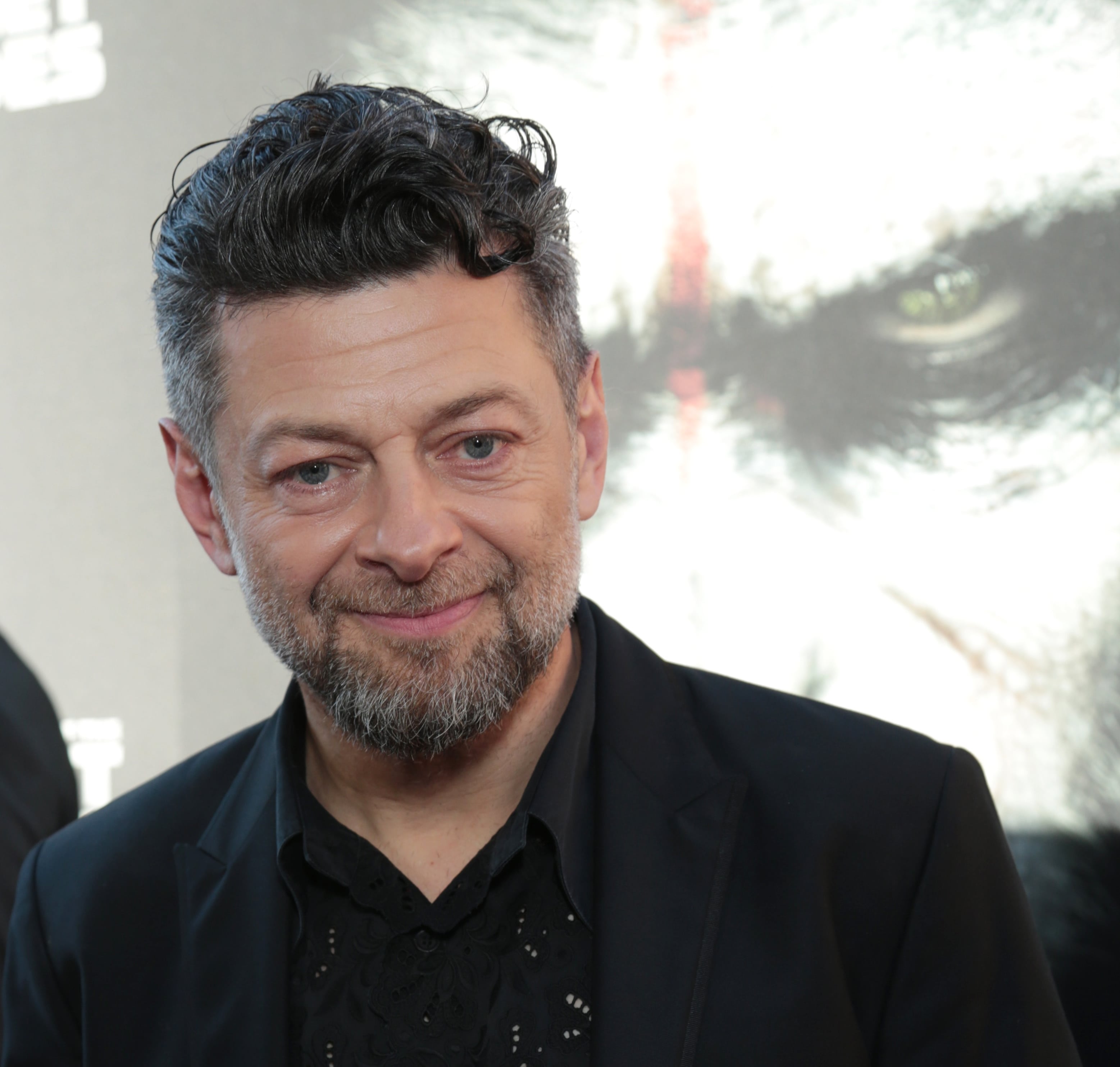 Description: A man with a beard and a black shirt and suit jacket smiling at the camera with a creepy face behind him.