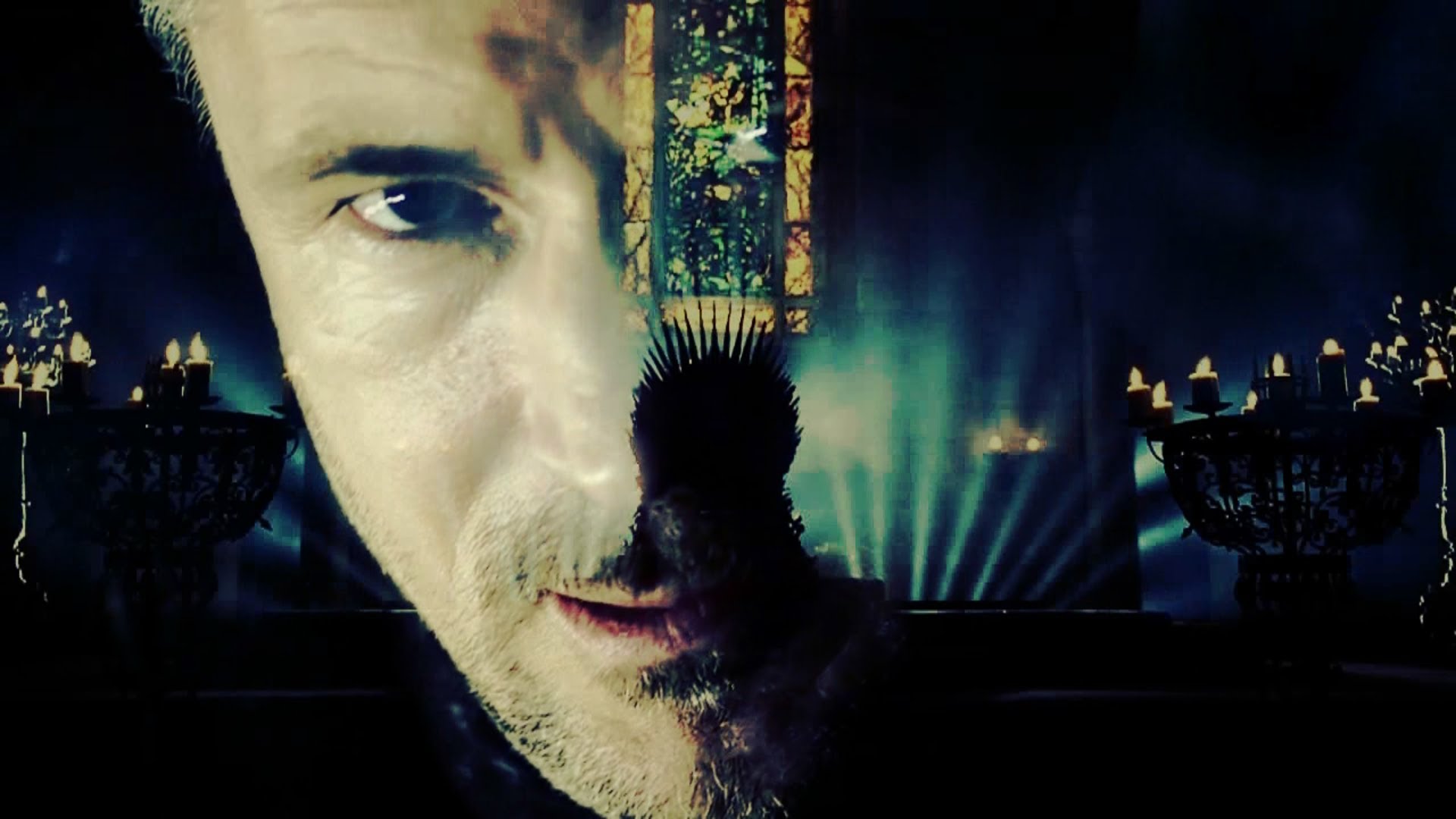 Description: A man with a beard and a black shirt is staring at the camera with a building in the background.