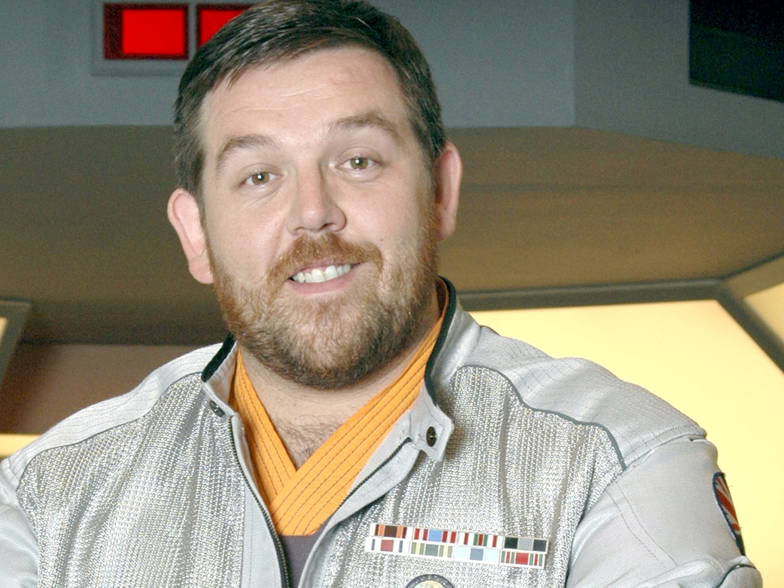 Description: A man with a beard and a collared shirt is smiling for the camera while wearing a badge on his collar.