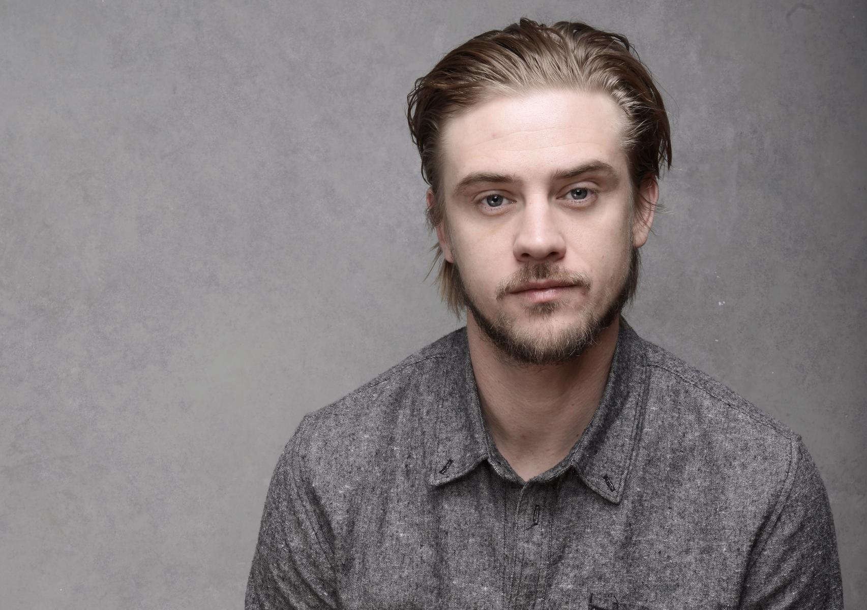 Description: A man with a beard and a shirt on posing for a picture with his hands folded out in front of him.