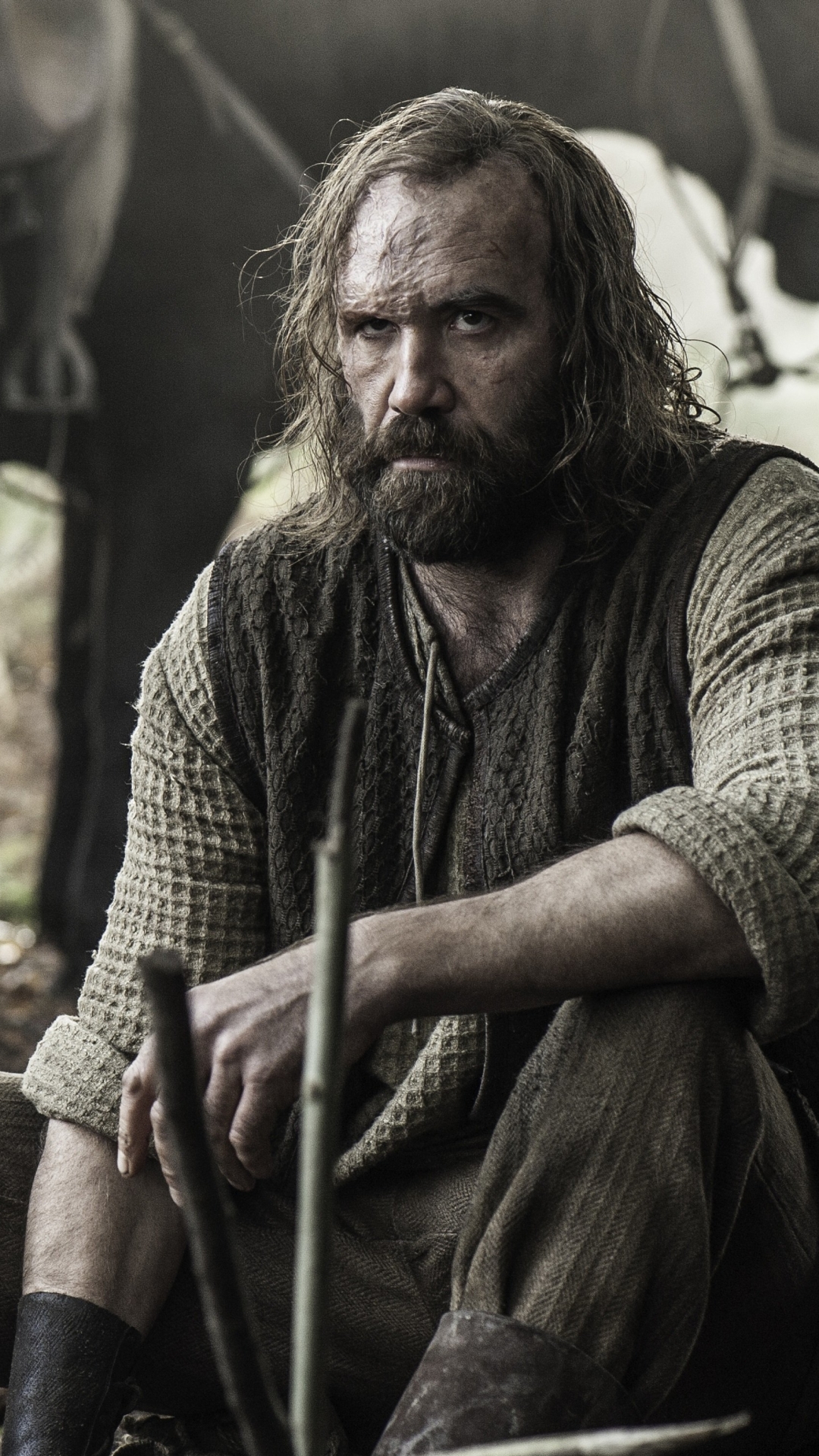 Description: A man with a beard sitting on the ground next to a horse in a barn area with a rope.