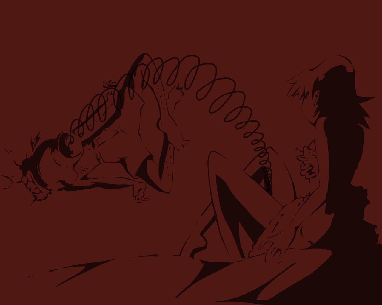 Description: A drawing of a man laying on a bed with a hat on his head and a woman standing next to him.