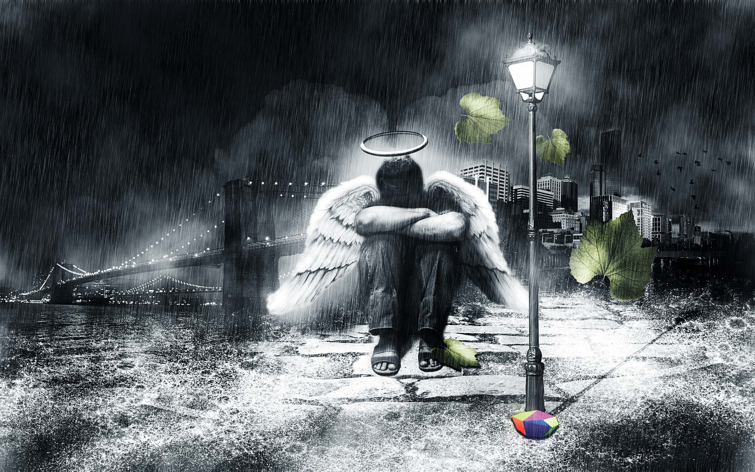 Description: A man sitting on a bench with an angel wings on his head and a lamp post in the foreground.