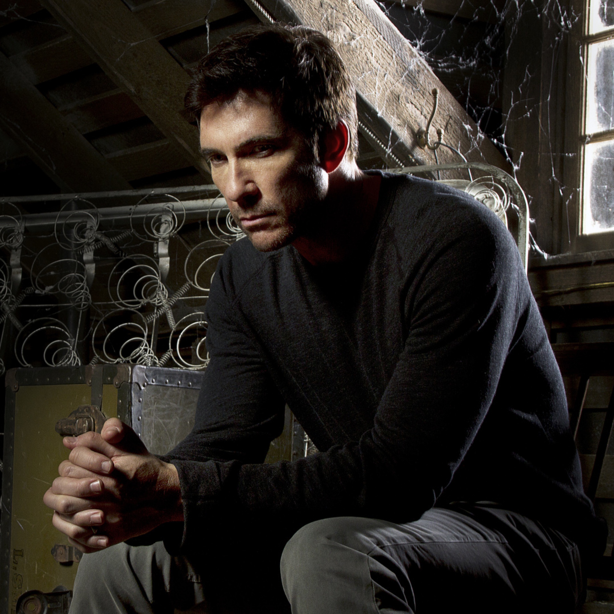 Description: A man sitting on a bench in a room with a metal fence and a window behind him.