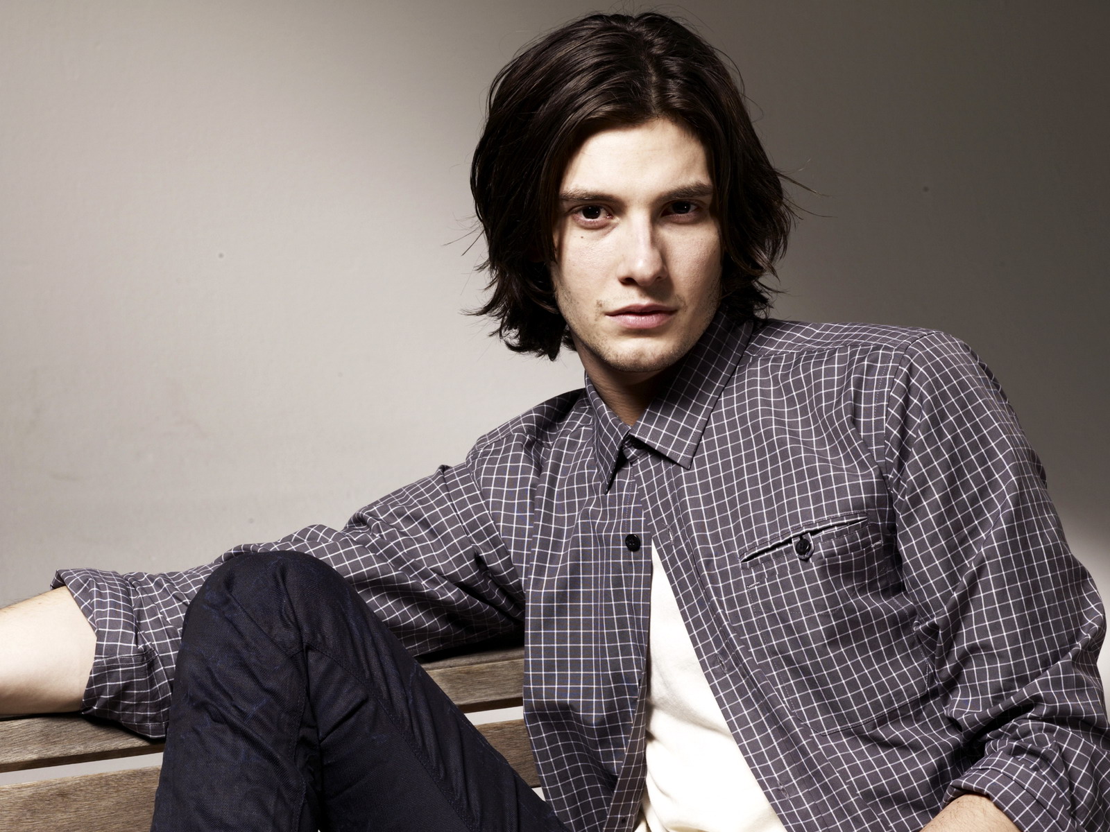 Description: A man sitting on a bench with his legs crossed and his hand on his hip.