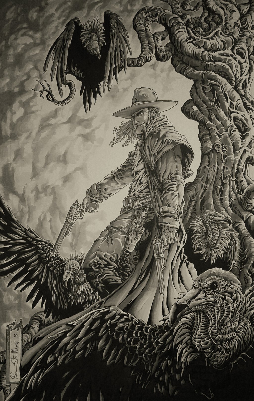 Description: A drawing of a man with a bird on his shoulder and a bird on his shoulder.