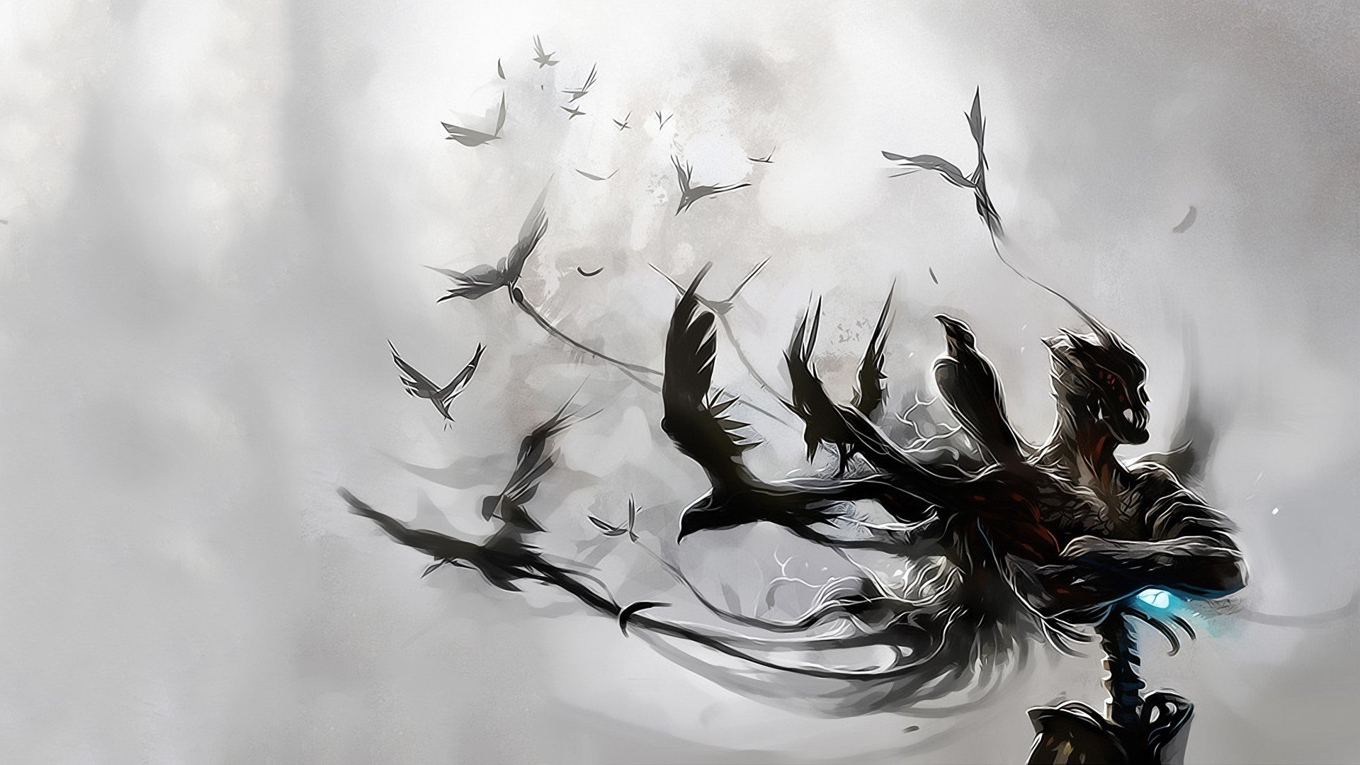 Description: A painting of a man with a bird in his hand and birds flying around him in the sky above him.