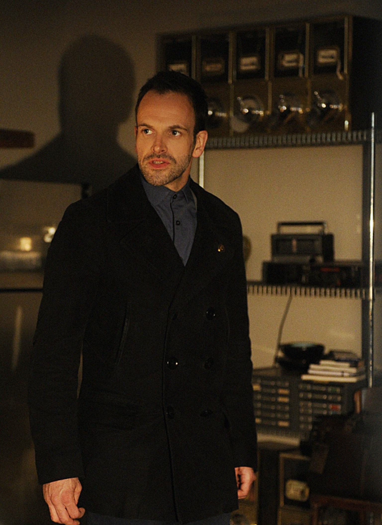 Description: A man in a black coat standing in a kitchen next to a stove top oven and a microwave oven.