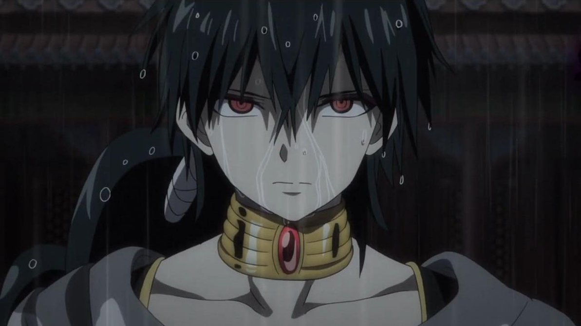 Description: A man with black hair and a collar around his neck and a red eye and a black hair and nose ring.