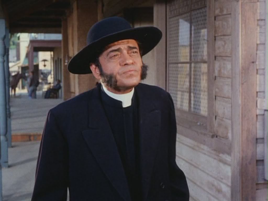 Description: A man in a black hat and coat standing in front of a building with a horse in the background.