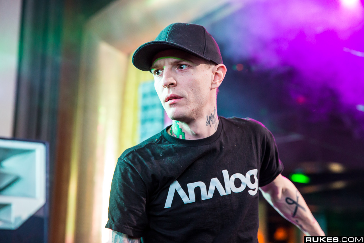 Description: A man with a black hat and a black shirt on and a purple and green background with a white logo.