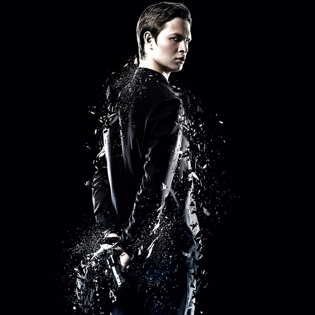 Description: A man in a black jacket with a gun in his hand and splashing water on his face and body.