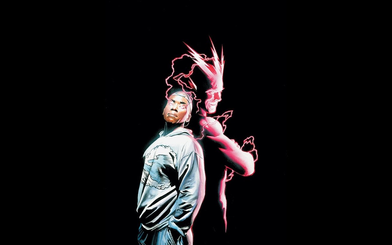 Description: A man in a black jacket and a red and white lightning flash behind him.