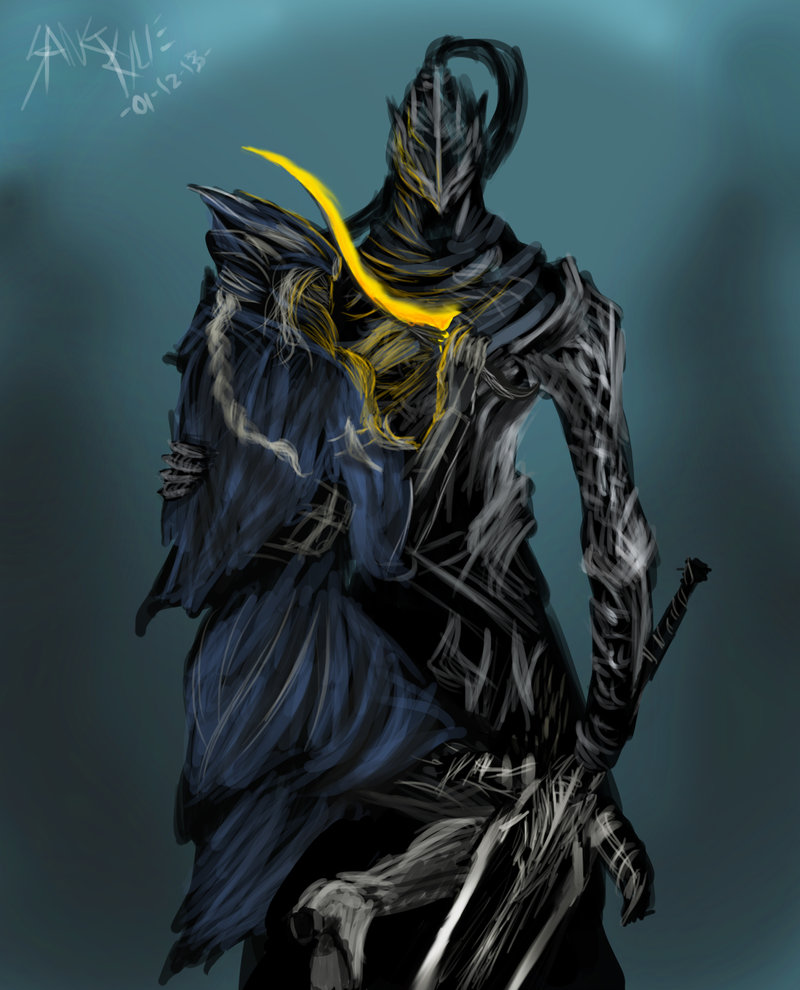 Description: A digital painting of a man in a black outfit with a yellow ring on his head and a sword in his hand.