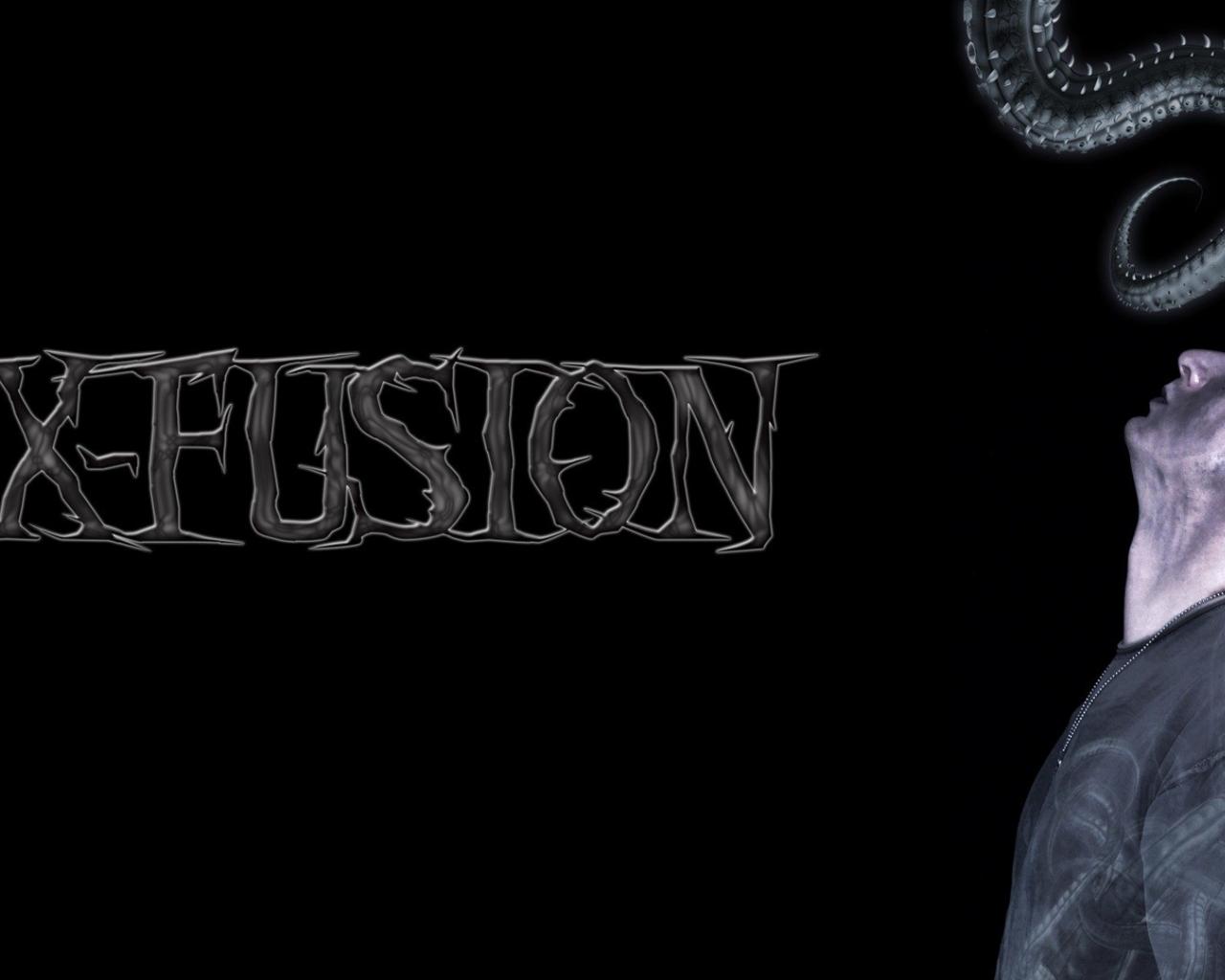 Description: A man with a black shirt and a black background with a black octopus on it's head and the words exfusion written in white.