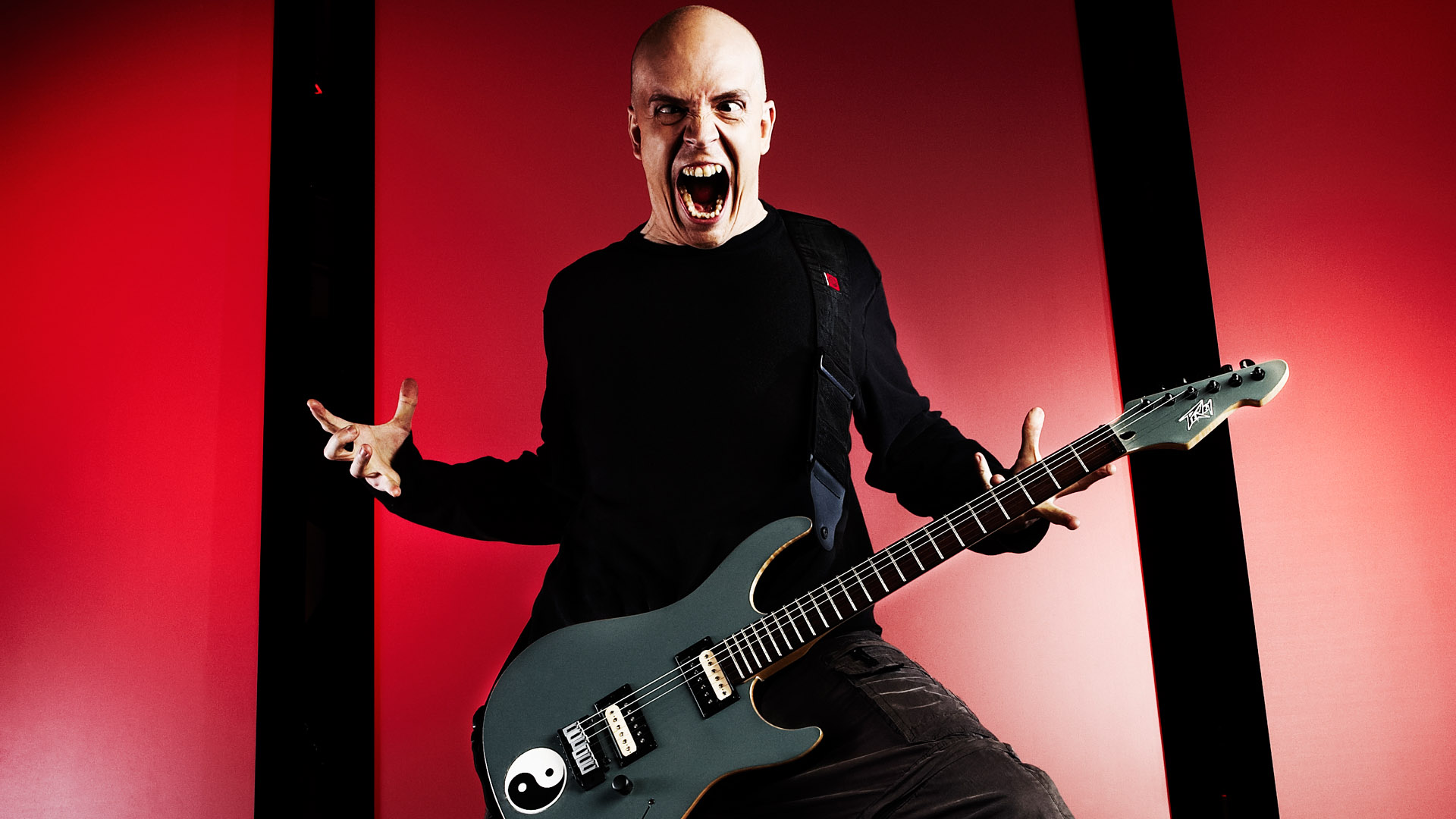 Description: A man with a black shirt and a black guitar in his hands and a red background behind him.