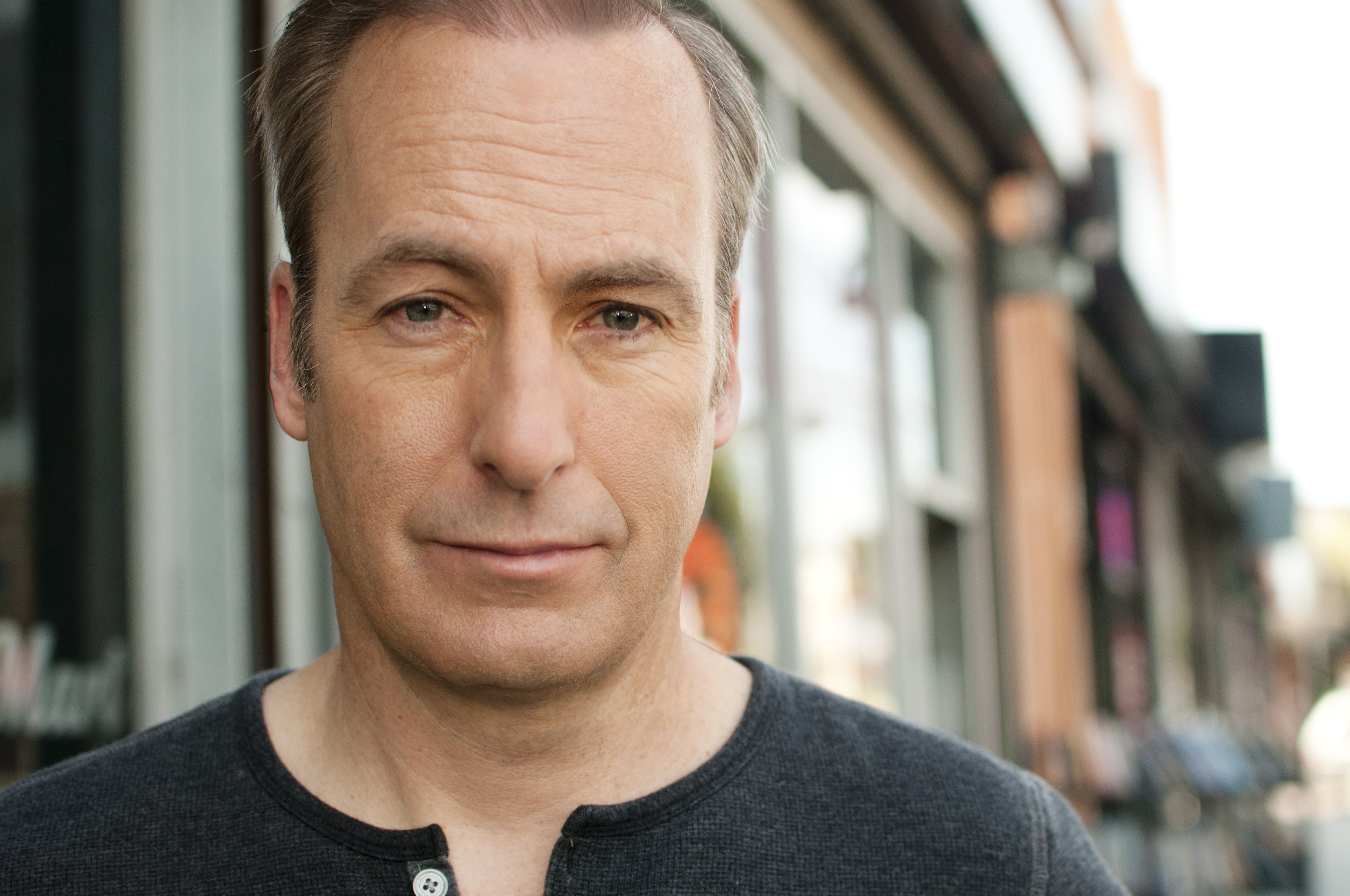 Description: A man with a black shirt and a gray shirt on a city street with a building in the background.