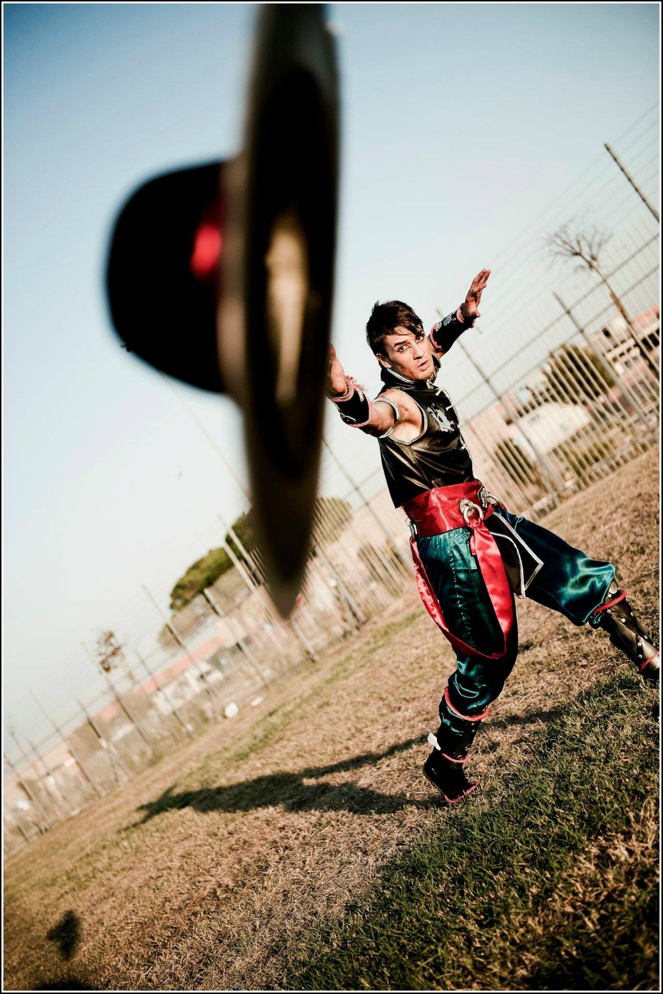 Description: A man in a black shirt and red pants is throwing a frisbee in the air with a red light.