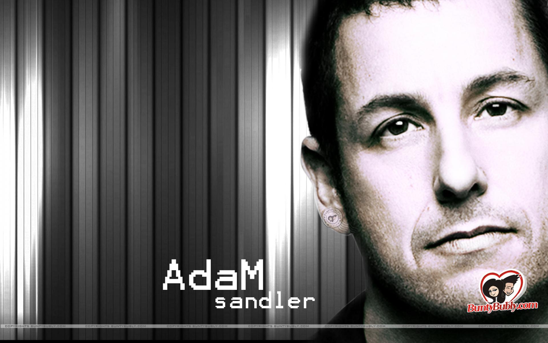 Description: A man with a black shirt and a red and white background with the words adam sandler on it.