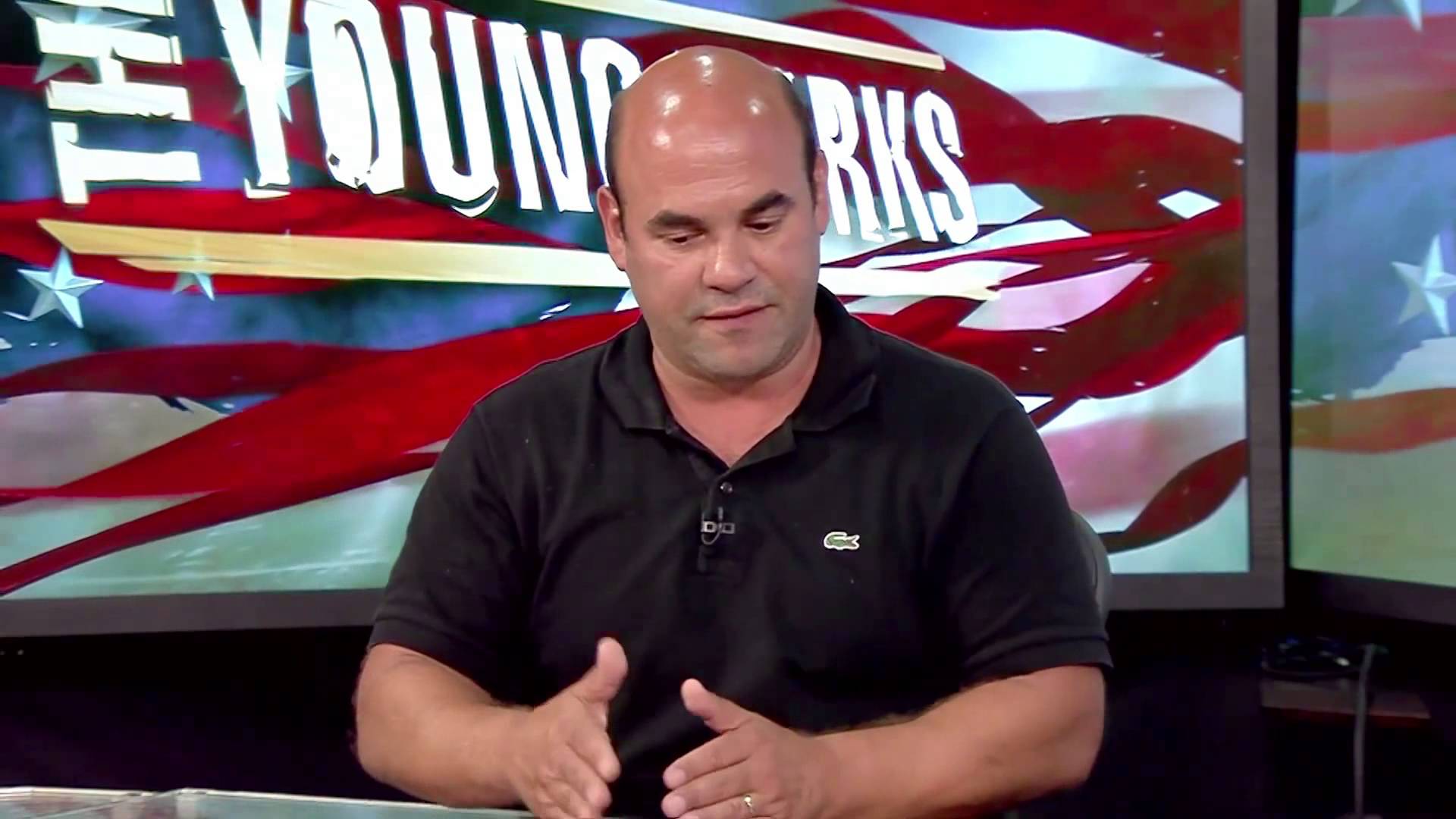 Description: A man in a black shirt is sitting down and talking to someone on a television screen with a flag behind him.