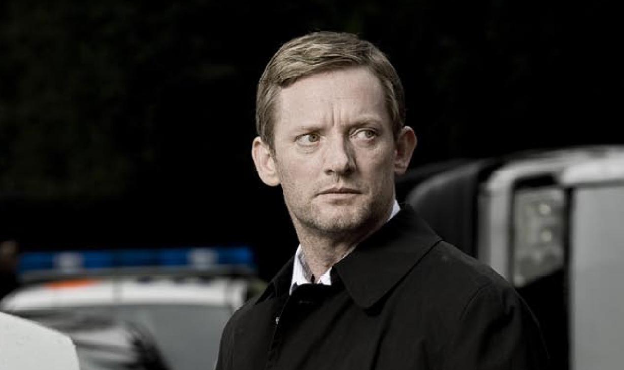 Description: A man in a black shirt and tie standing in front of a truck with a police car in the background.