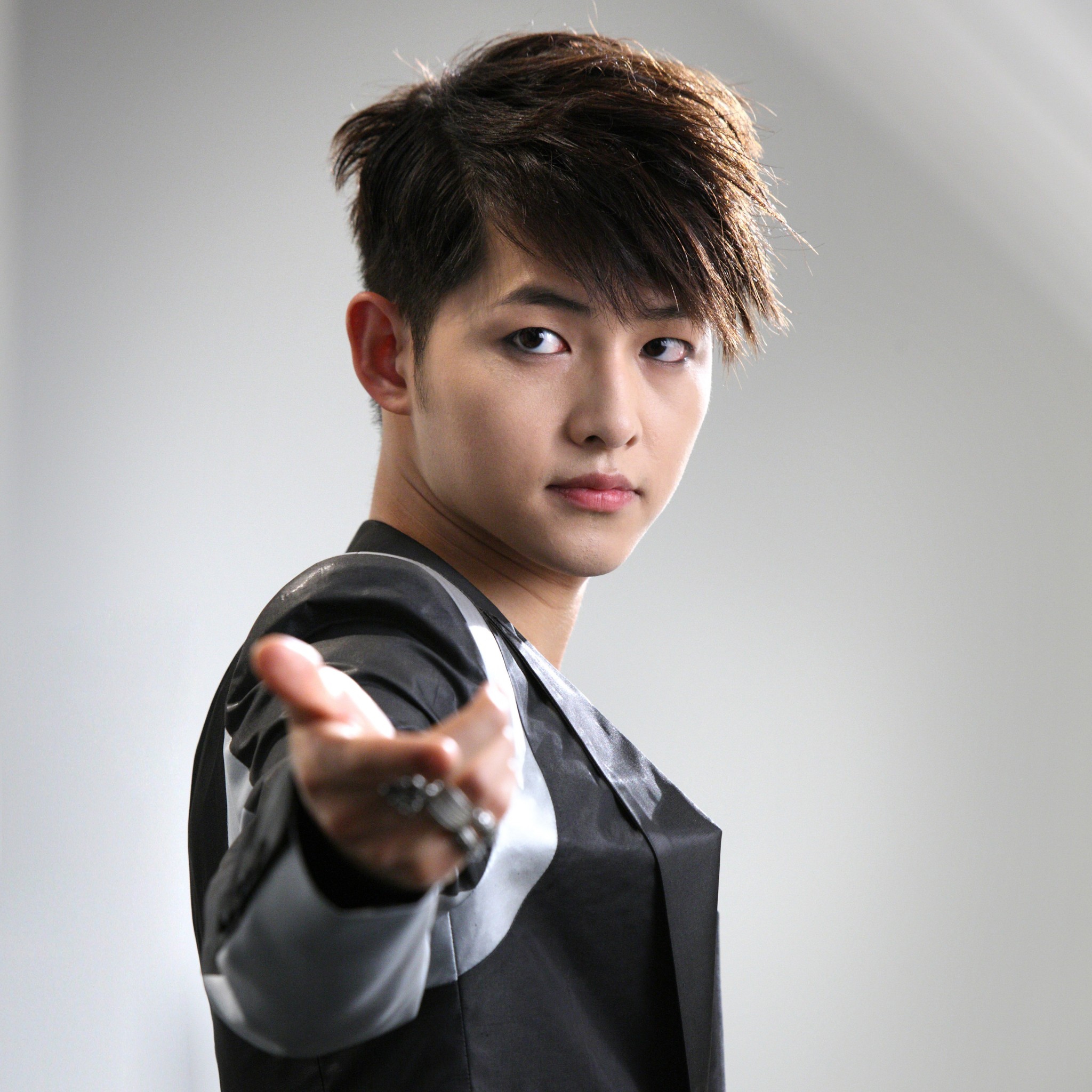 Description: A man with a black shirt and a black vest pointing a finger at something with a white background and a white wall.
