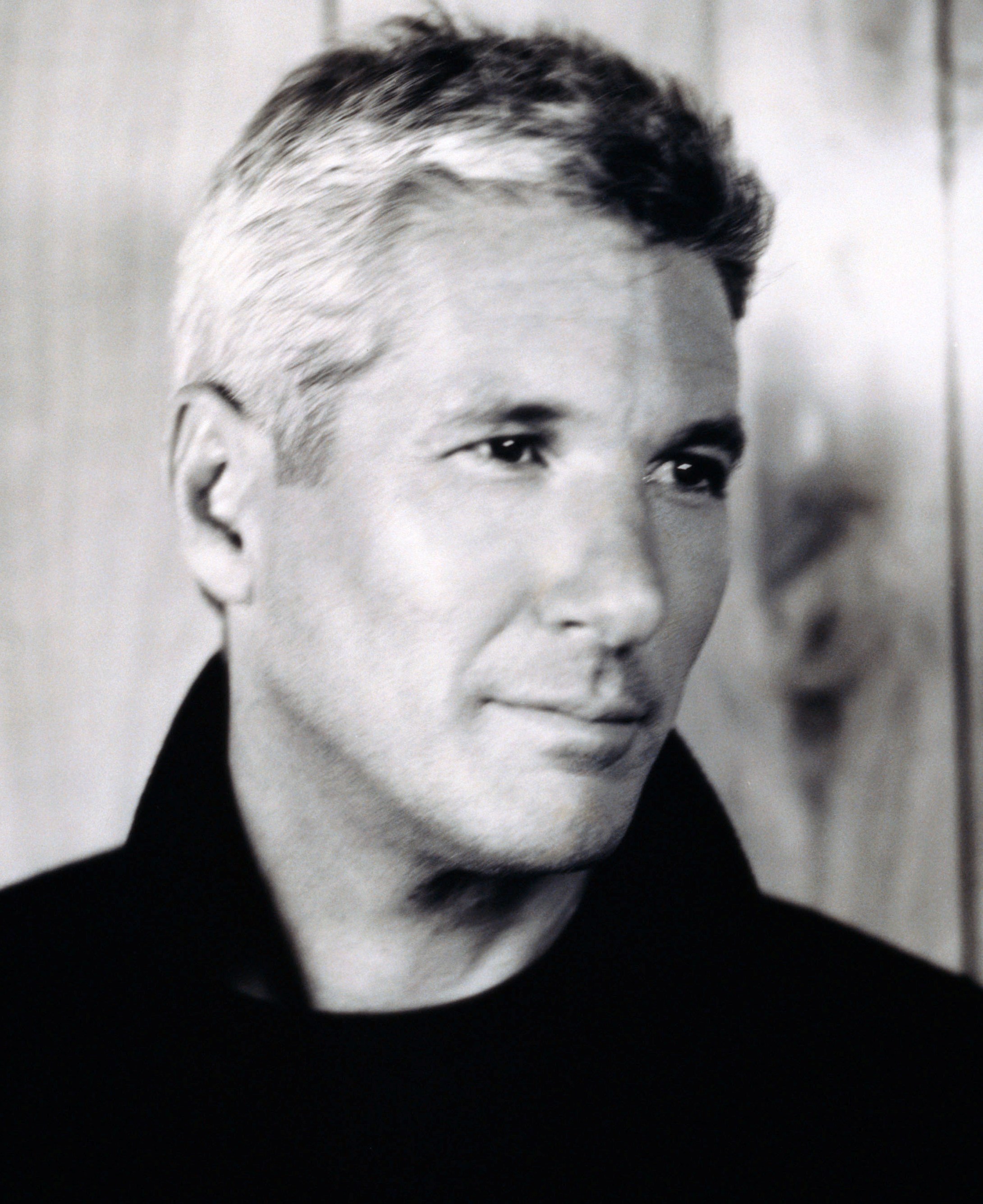 Description: A man with a black shirt and a wooden wall behind him is looking at the camera and he is wearing a black shirt.