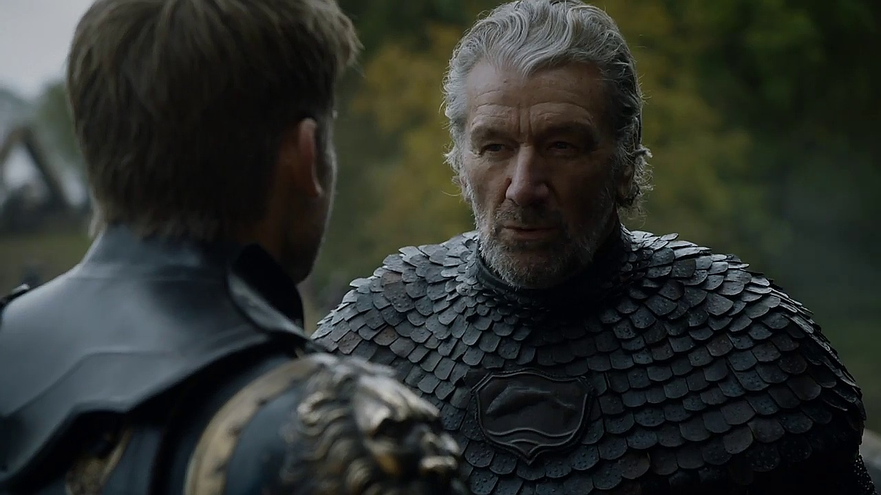Description: A man in a black suit and a man in a silver suit are facing each other in a field.