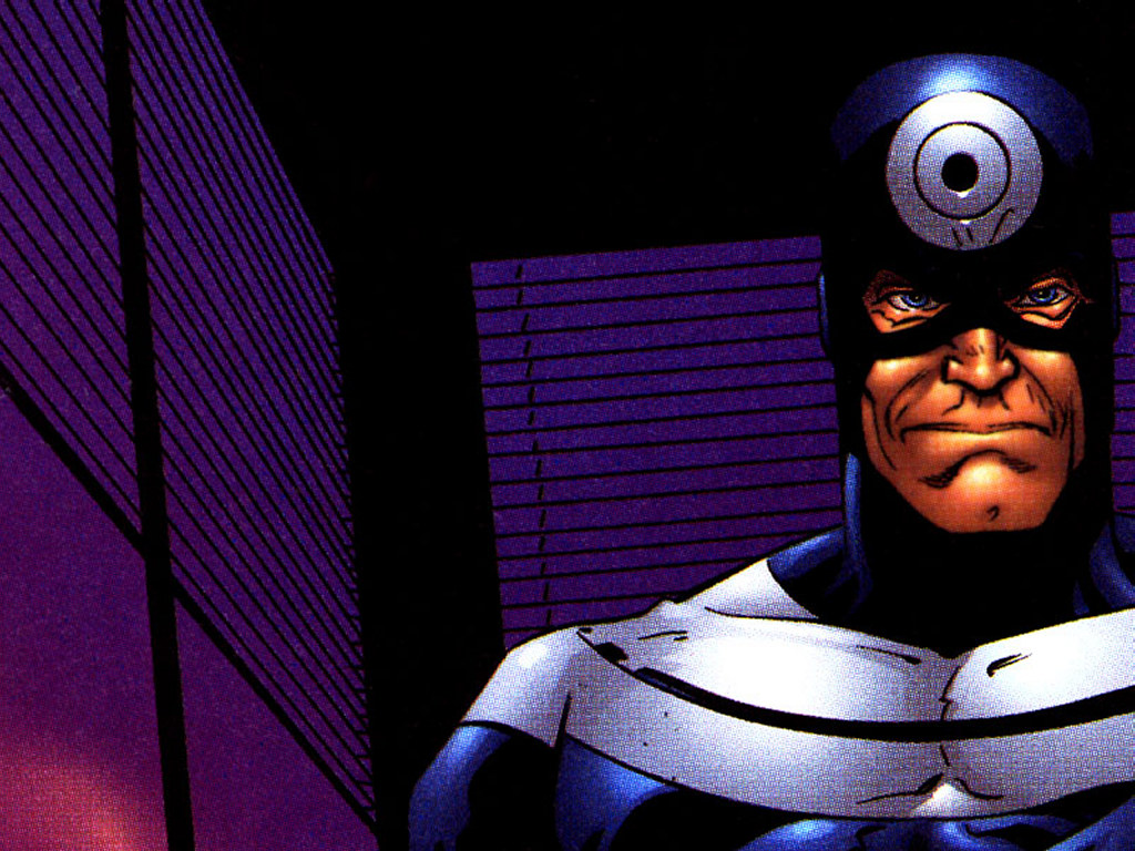 Description: A man in a black and white costume standing in a purple room with a purple background and a black and white mask.