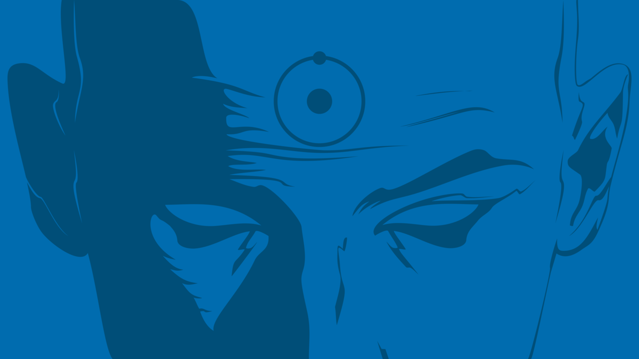 Description: A man with a blue background has a strange eye on his face and a black tie on his neck.