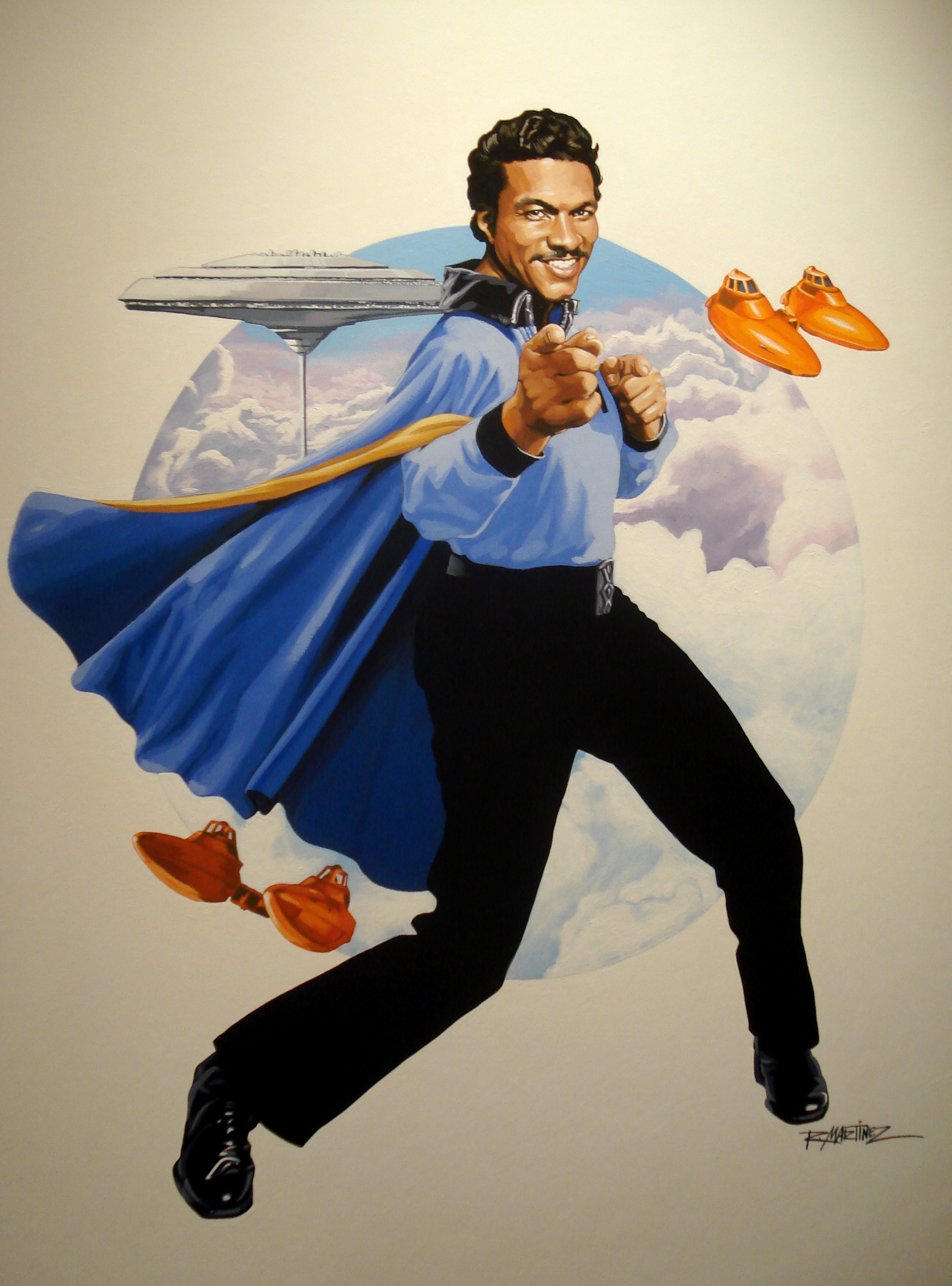Description: A painting of a man in a blue cape and shoes with a gun in his hand and a spaceship in the background.
