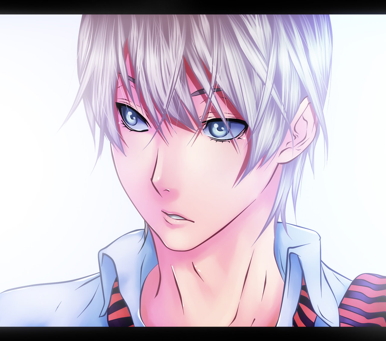 Description: A man with blue eyes and a striped shirt on his shirt is staring at the camera with a serious look on his face.