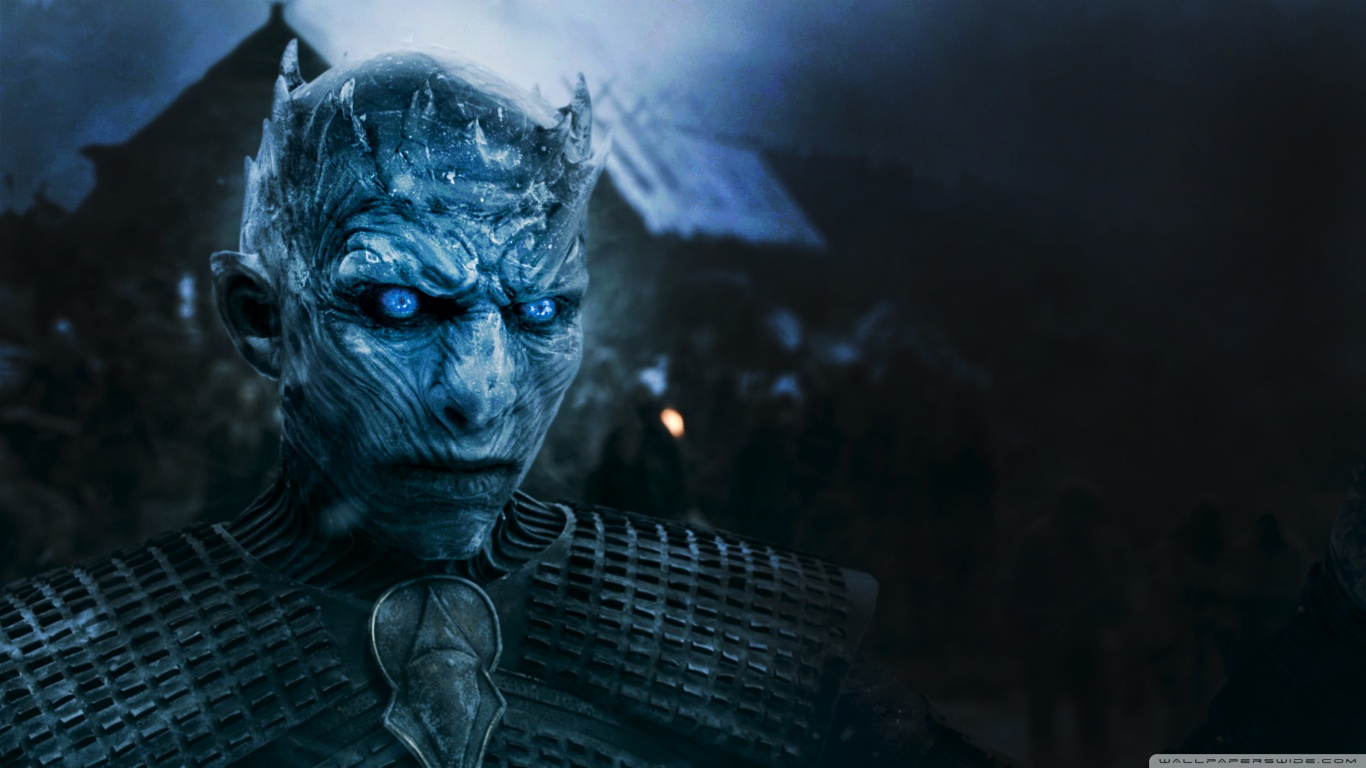 Description: A man with blue eyes and a white face in a dark background with a crowd of people behind him.