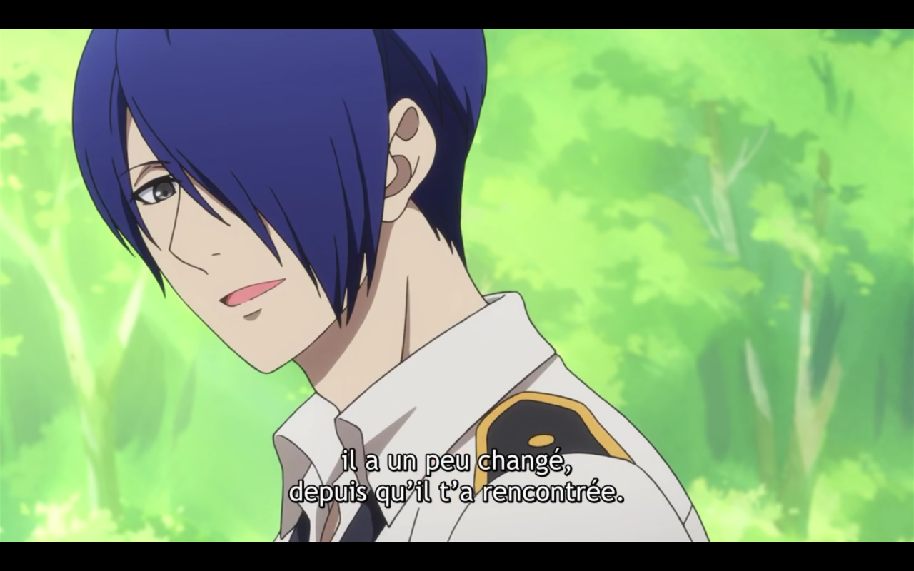 Description: A man with blue hair and a white shirt with a quote on it that says.