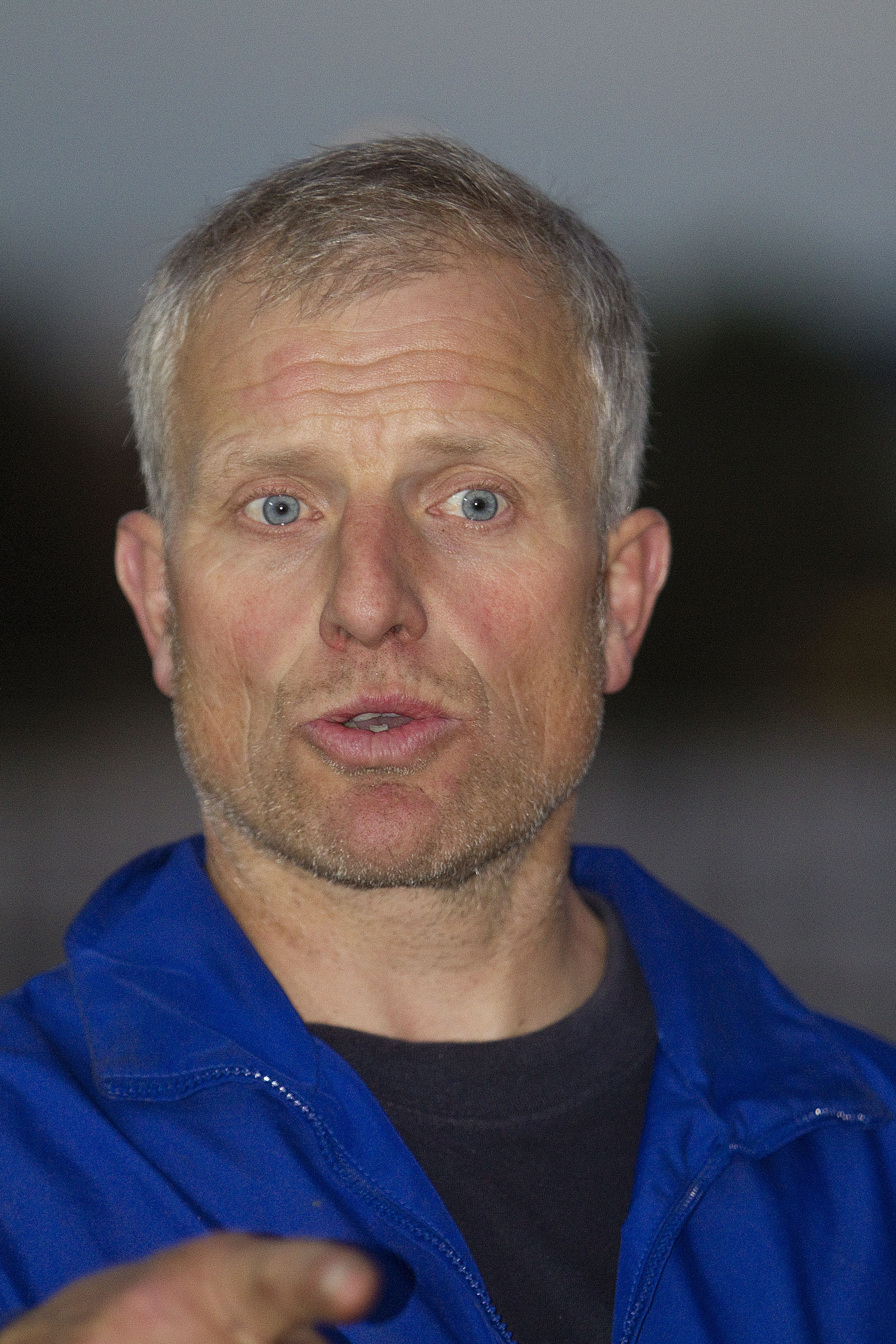 Description: A man in a blue jacket is making a face with his finger to the side of his face and looking at the camera.