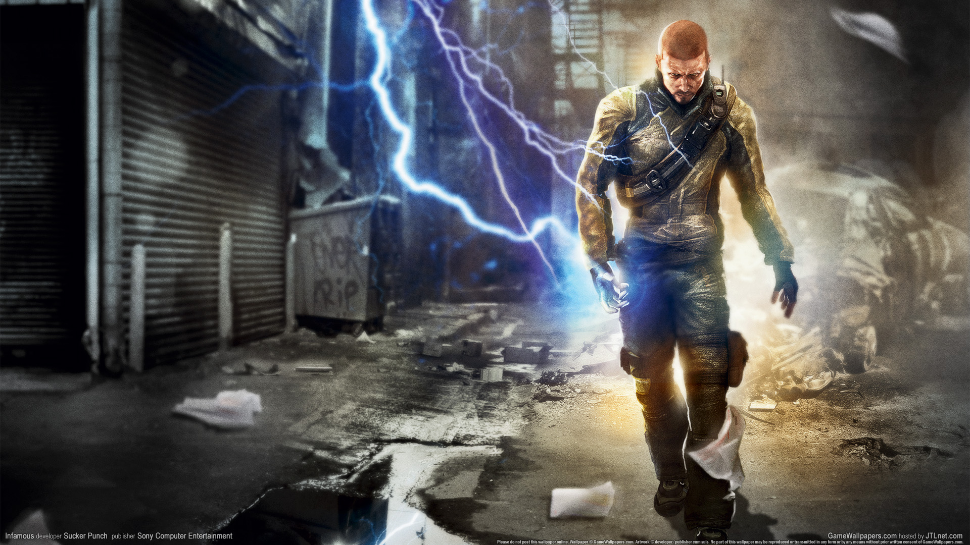 Description: A man in a blue leather outfit is walking through a city street with a lightning bolt in the background.