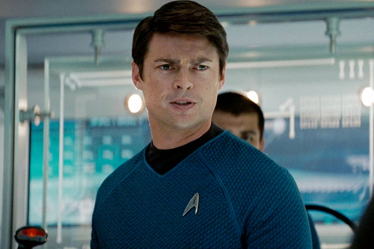 Description: A man in a blue shirt standing in a room with other people in the background and a mirror behind him.