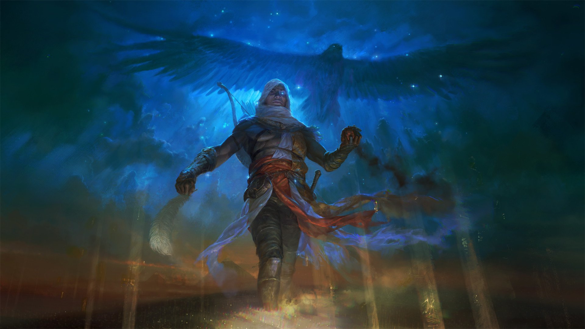 Description: A man in a blue suit with a large bird on his arm and a sword in his hand.