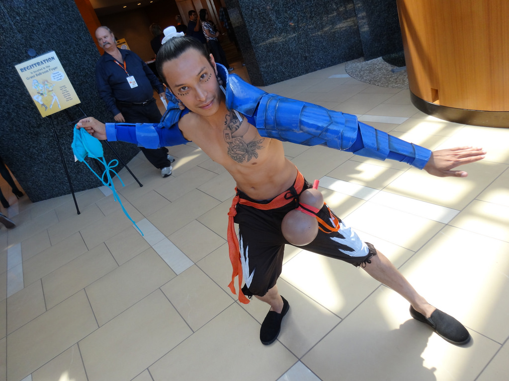 Description: A man in a blue suit is dancing on a tile floor with his arms outstretched and legs spread out.