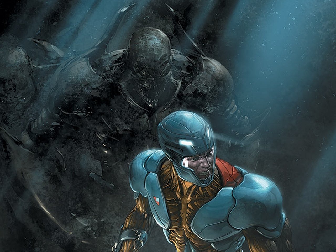Description: A man in a blue suit and helmet standing in front of a giant robot in a dark room with light beams.