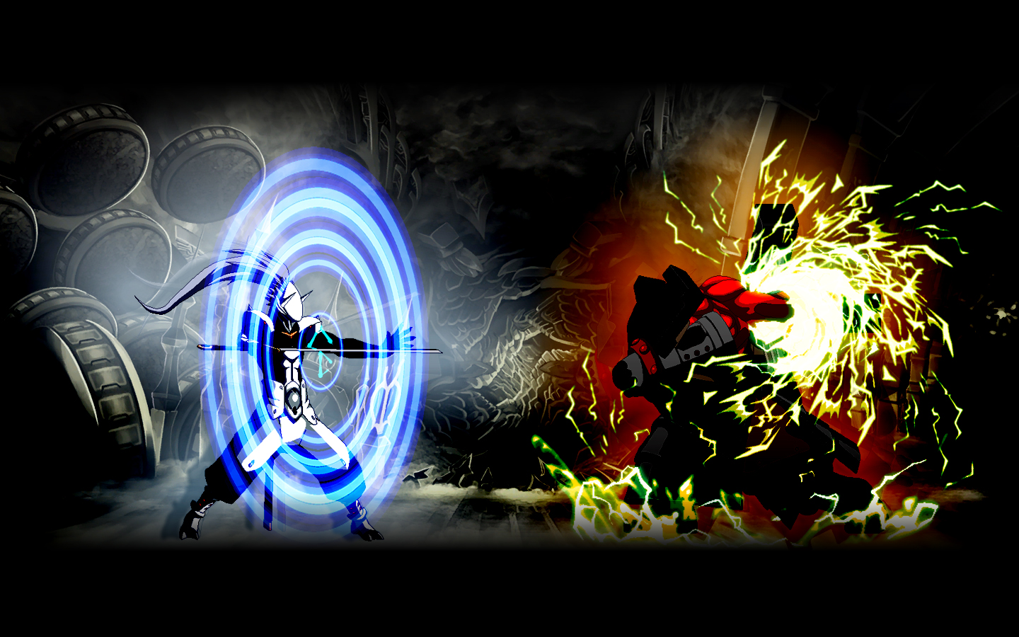 Description: Two animated images of a man with a bow and arrow in a dark room with a fire and smoke background.