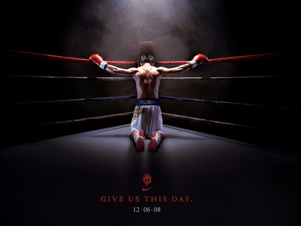 Description: A man with boxing gloves on sitting in a boxing ring with a red boxing ring on his knees and a red boxing glove on his chest.