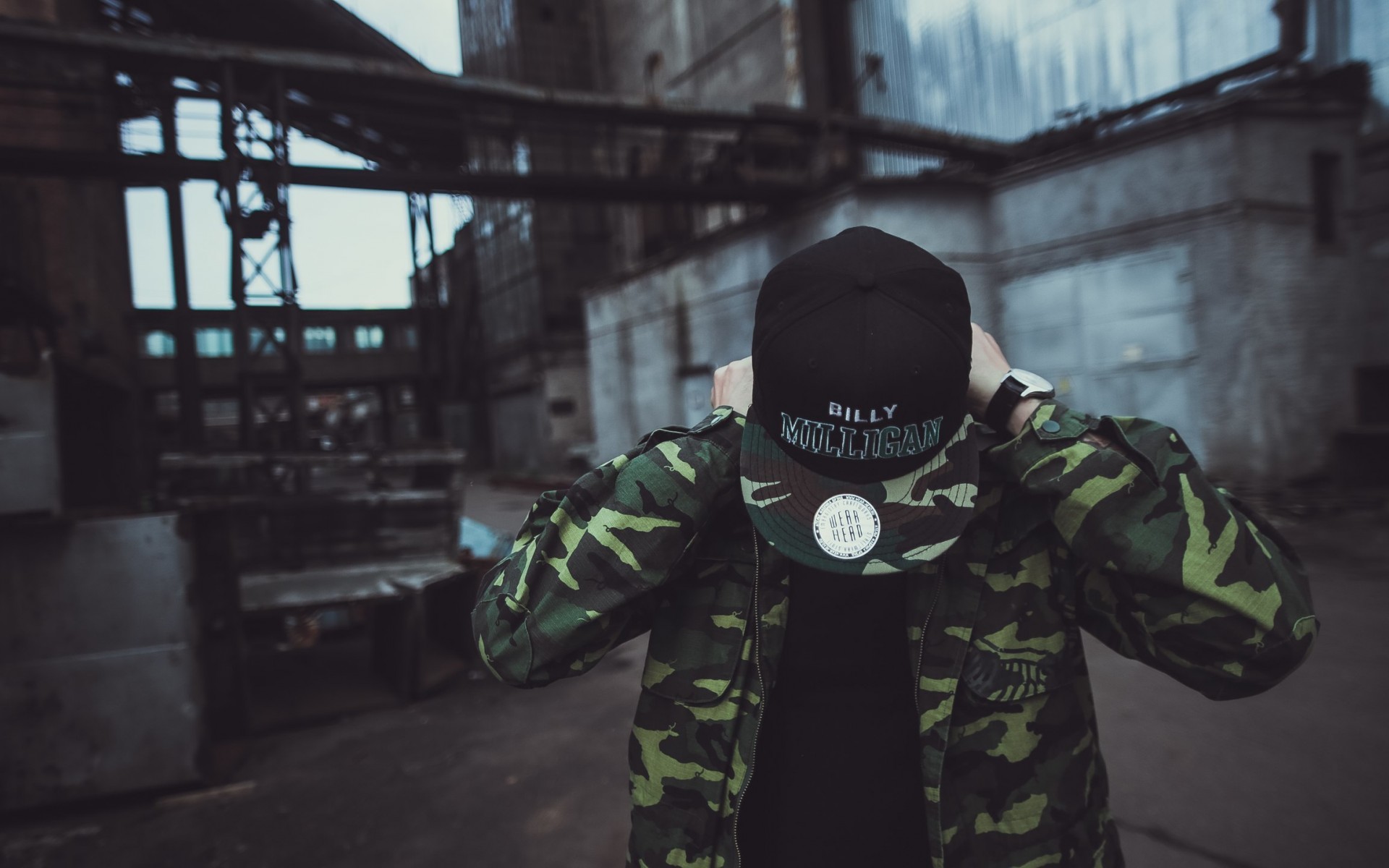 Description: A man in a camouflage jacket covering his face with his hands and covering his eyes with his hands.