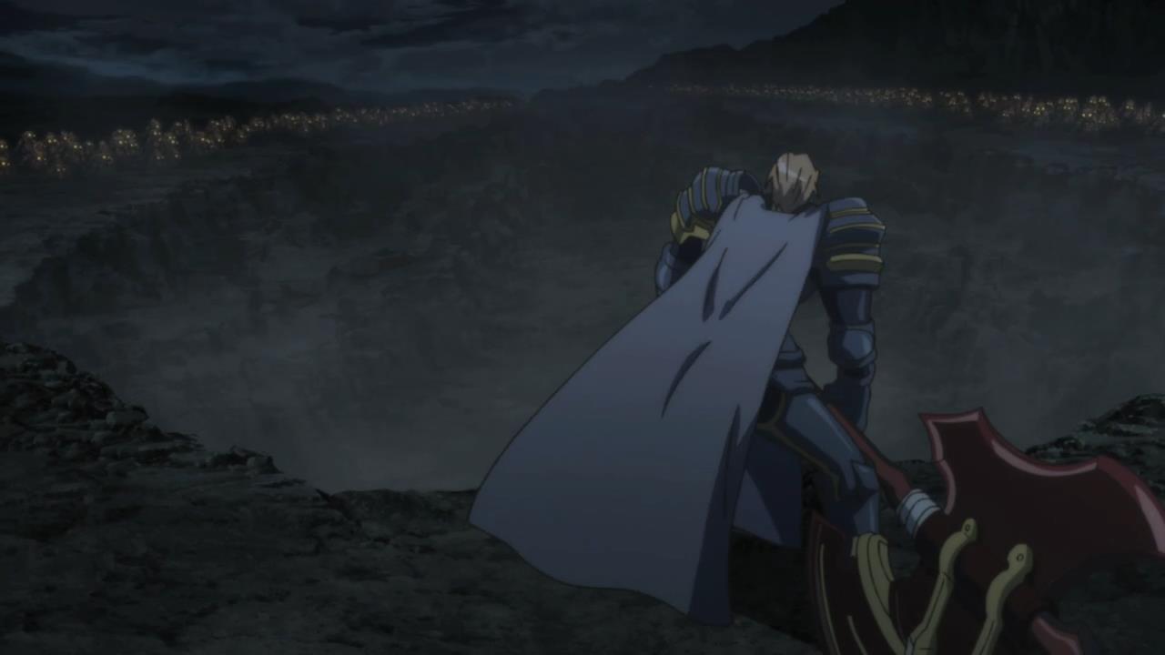 Description: A man in a cape standing on a hill at night with his arms around his head and his back to the camera.