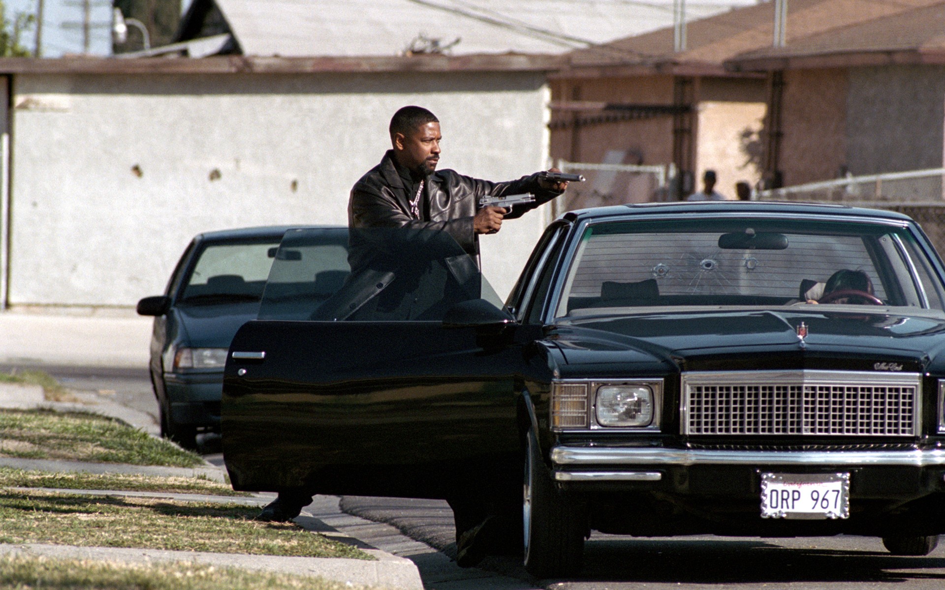 Description: A man standing next to a car on a street with a gun in his hand and another car behind him.