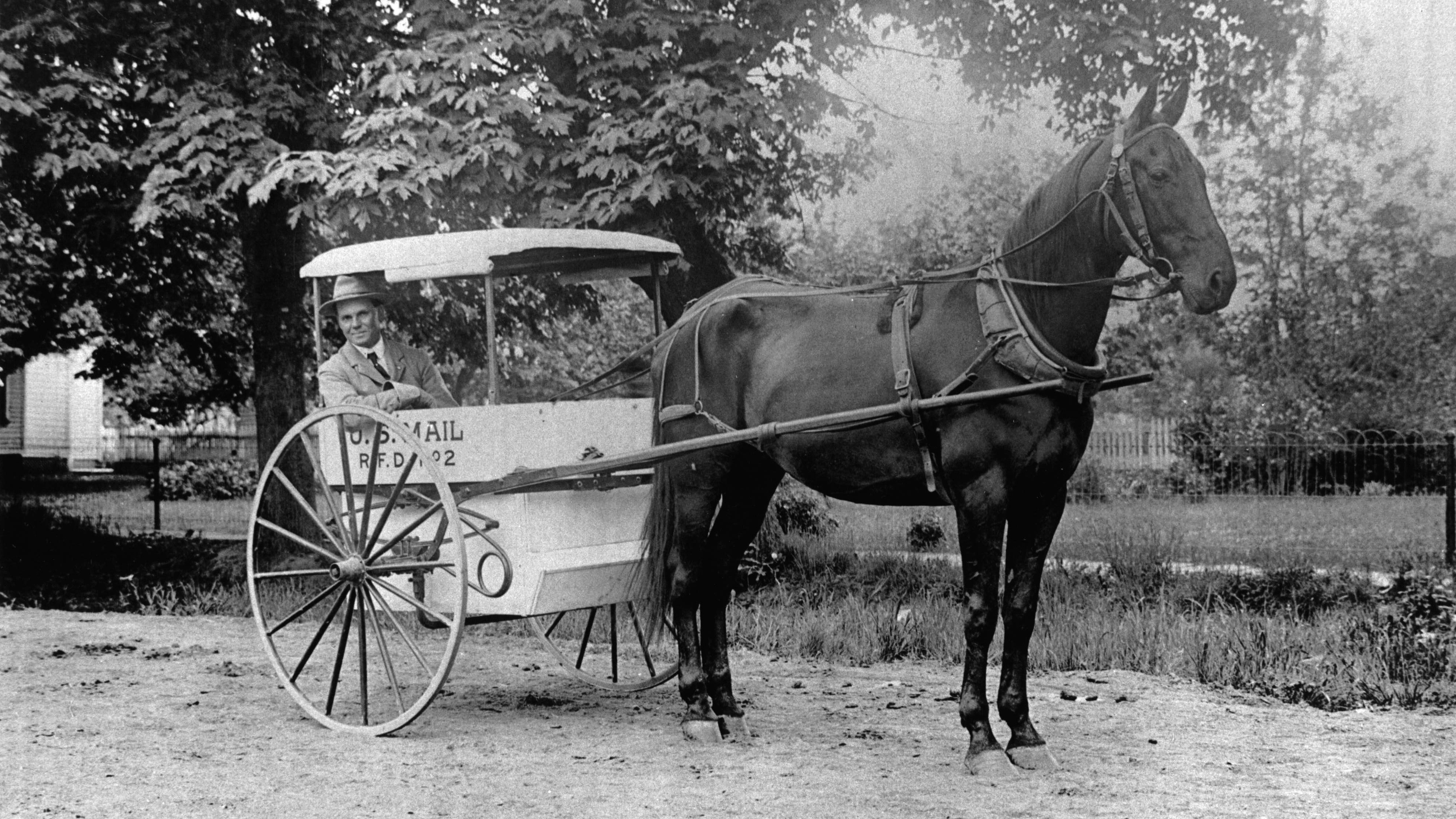 Description: A man sitting in a horse drawn carriage in a park area with trees and grass in the background.