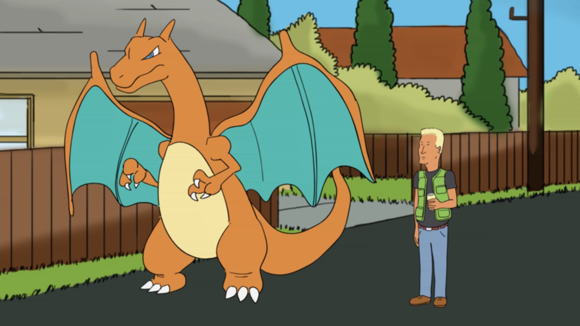 Description: A man standing next to a cartoon dragon on a street next to a house and a woman standing next to a house.
